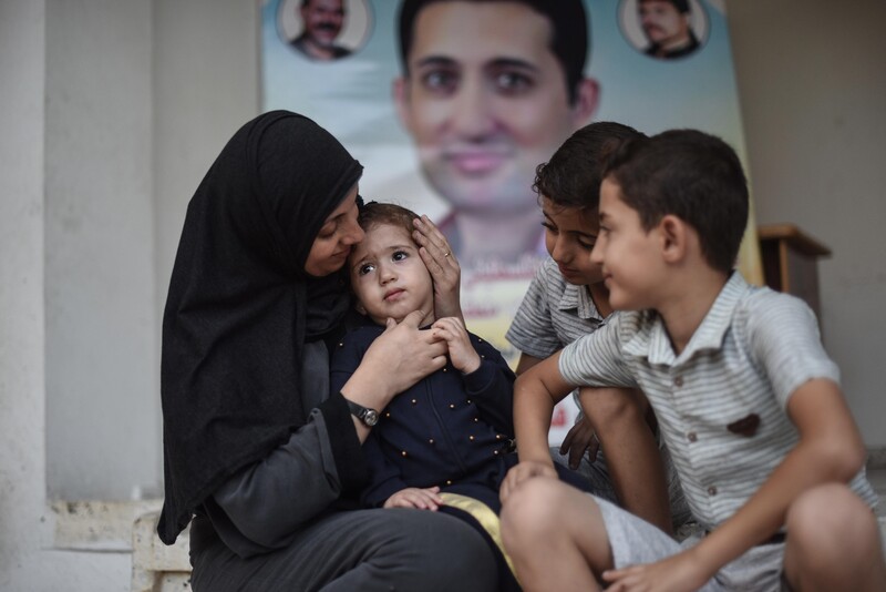Marwa al-Sultan with her daughter Mira and two sons. A poster of her late husband Tamer is seen behind them. By Sarah Algherbawi: Two-year-old Mira al-Sultan keeps asking when her dad will come home. Sadly, her father is dead, but Mira’s mother can’t yet find a way of explaining that to her.