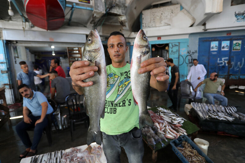 Palestinian fishers display their catch at a Gaza City market after Israel expanded the permitted fishing zone to 15 nautical miles off of Gaza’s coast, 2 September.