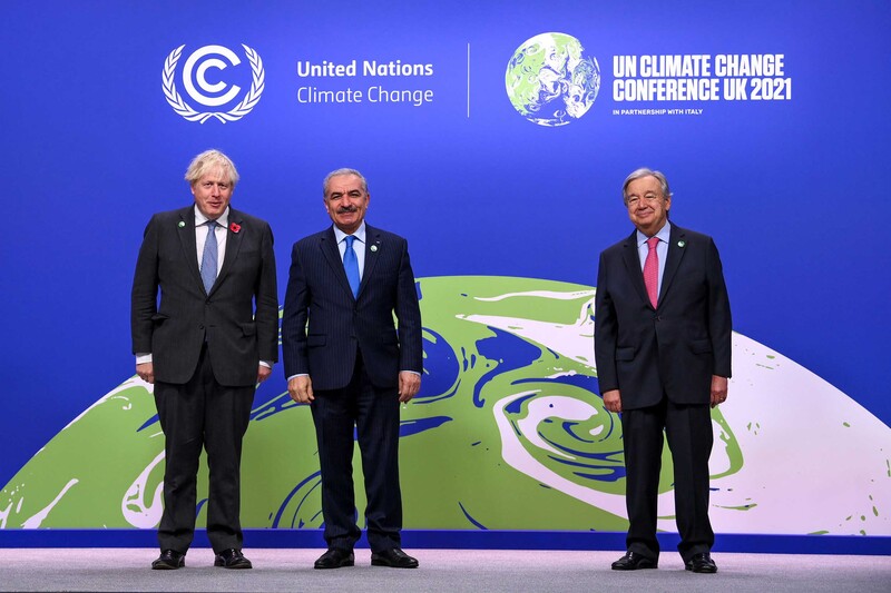 Palestinian Authority Prime Minister Mohammed Ishtayeh poses with UK Prime Minister Boris Johnson and UN Secretary-General Antonio Guterres at an event on the sidelines of the COP26 UN Climate Change Conference in Glasgow, Scotland, on 1 November.