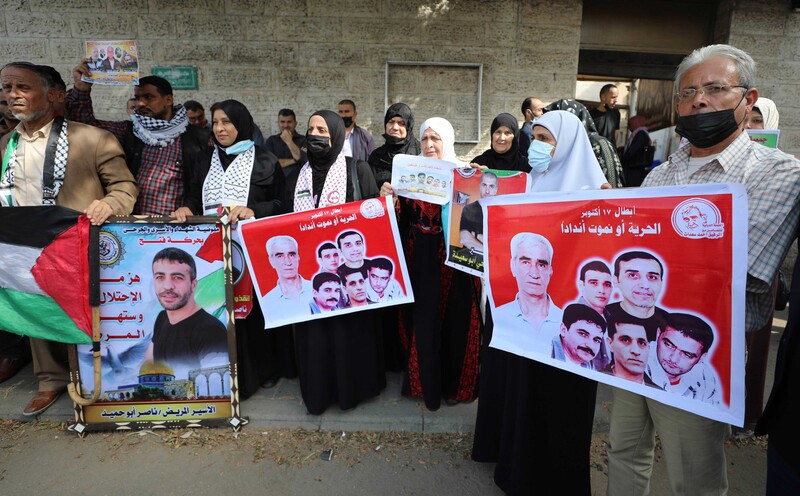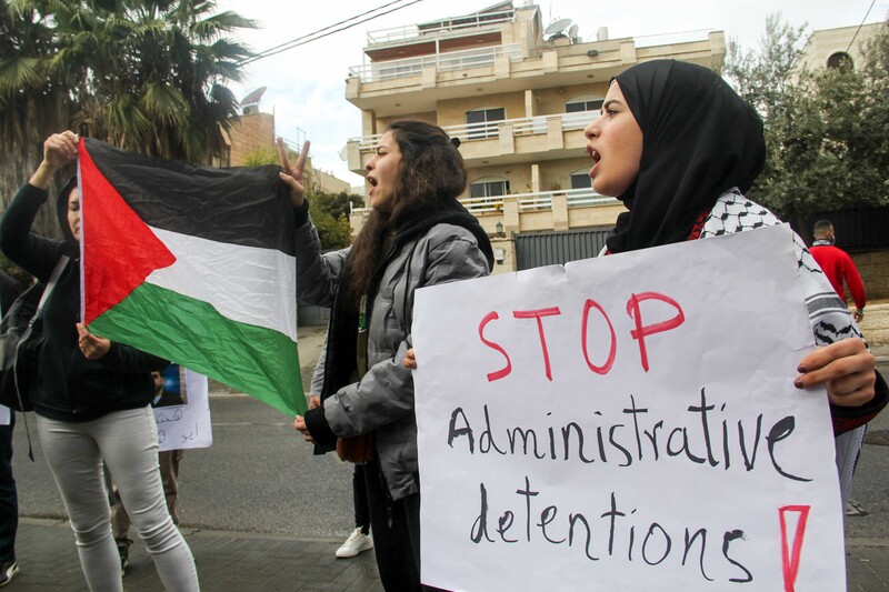 Palestinians in the Sheikh Jarrah neighborhood of East Jerusalem call for the release of Palestinian prisoners held without charge or trial by Israel under administrative detention orders on 21 November.