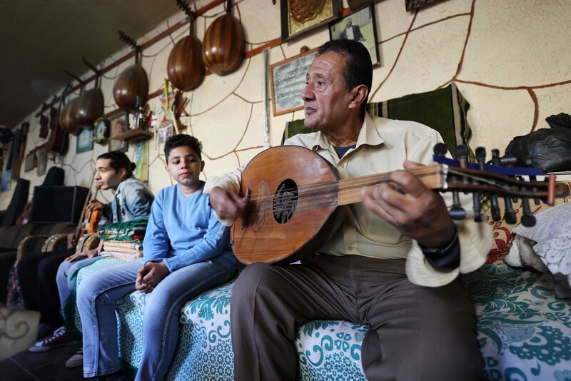 Palestinian musician Khader al-Bayed gives lessons to youth at his Gaza City home on 10 November.