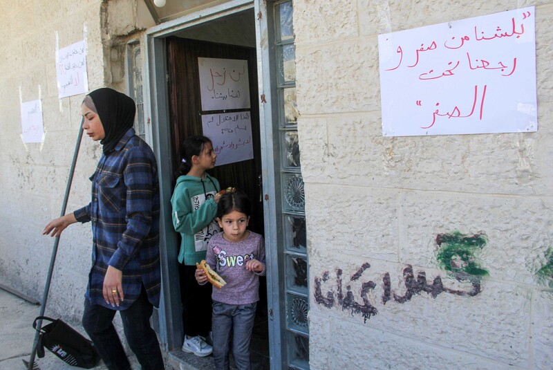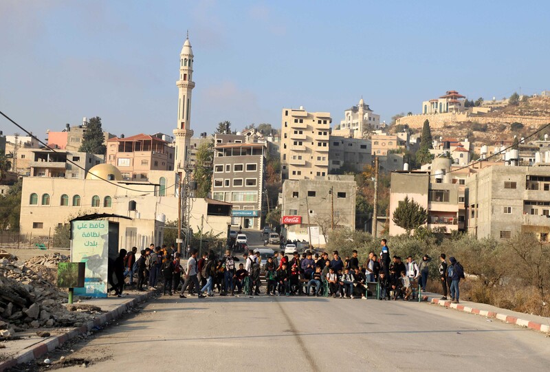 Palestinians block a road after Israeli occupation forces and settlers prevented Palestinian students from reaching their school in al-Lubban al-Sharqiya village, south of Nablus, in the northern West Bank on 18 November. For the third consecutive day, Israeli forces assaulted Palestinian students on their way to school in the village.