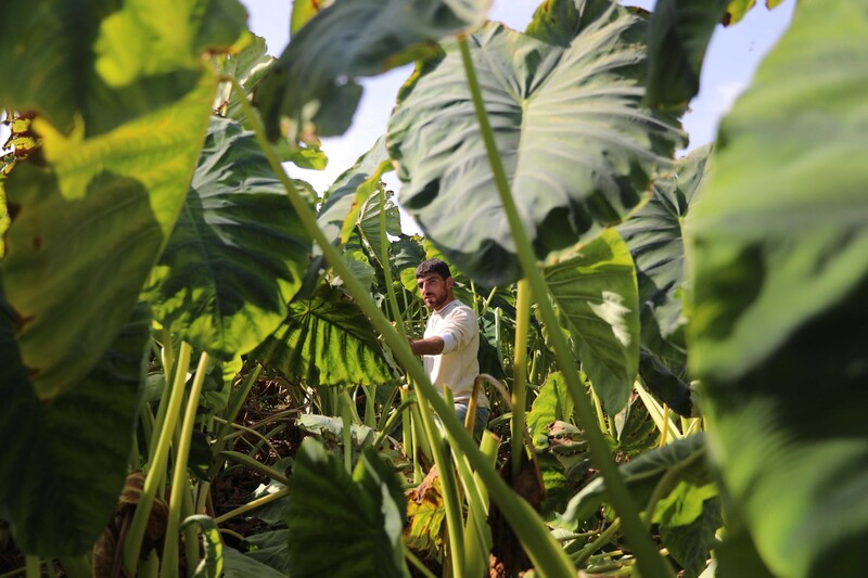 A Palestinian farmer harvests taro in Gaza City on 13 November. The root vegetable, similar to the yam, is a food staple in African, Oceanic and South Asian cultures and is believed to be one of the earliest cultivated plants.