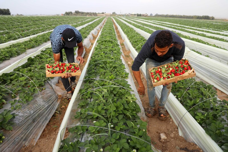 Palestinian farmers in Beit Lahiya, northern Gaza, harvest strawberries for export to the West Bank on 17 November.