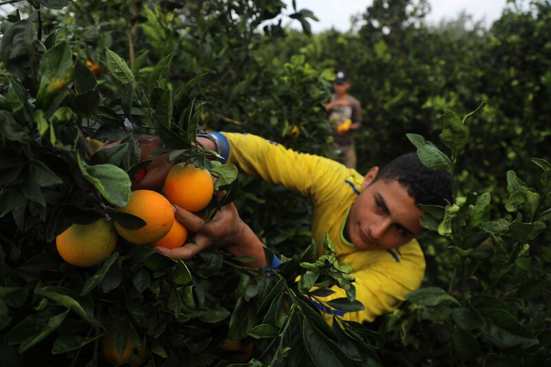 Palestinian farmers harvest oranges in Beit Lahiya, northern Gaza Strip, on 20 November.