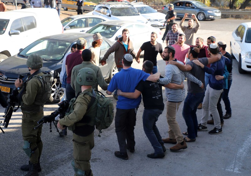 Israeli settlers dance as occupation forces stand guard while blocking the entrance to the Palestinian village of al-Lubban al-Sharqiya, south of the West Bank city of Nablus, on 28 November. Dozens of rampaging Israeli settlers attacked the village and prevented Palestinian children from going to school.