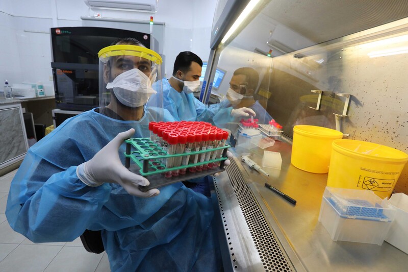 A Palestinian laboratory medicine specialist carries out COVID-19 tests in Gaza City on 28 November.