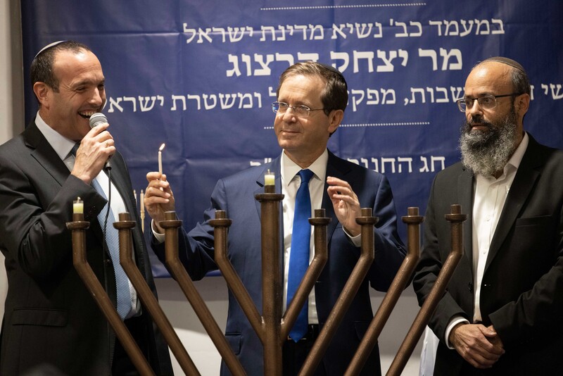 Israeli president Isaac Herzog takes part in a Hanukkah celebration inside the Ibrahimi mosque, also known as the Tomb of the Patriarchs in the West Bank city of Hebron on 28 November. Believed to be the final resting place of the prophet Abraham, a holy figure for Jews and Muslims, the mosque was also the site of a massacre by a Brooklyn-born settler who gunned down 29 worshippers in 1994. Following the massacre, Israel strengthened its grip over the city, partitioning the mosque and allowing more settlers to take over Palestinian properties.