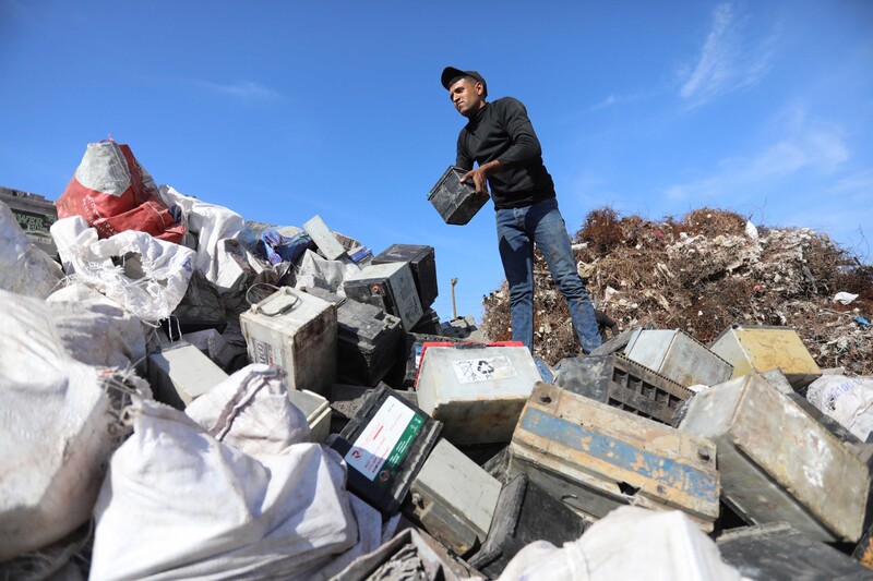 A Palestinian worker sorts through electronic waste such as batteries, a popular product in the midst of Gaza’s electricity crisis, after Israeli authorities prevented the export of 25,000 tons of damaged batteries in Jabaliya, northern Gaza Strip, 29 November.