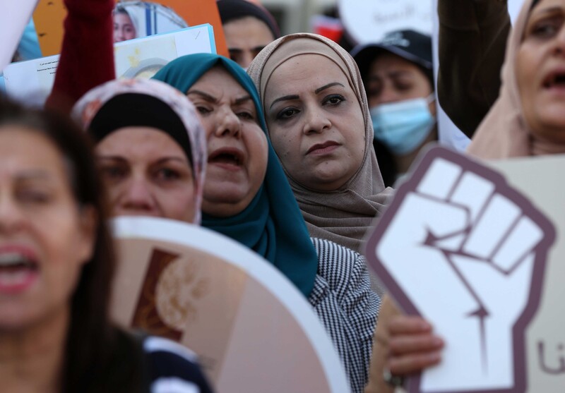Palestinian women call for protection against domestic violence and the adoption of a family protection law during the weekly meeting of the Palestinian government in the West Bank city of Nablus on 29 November.