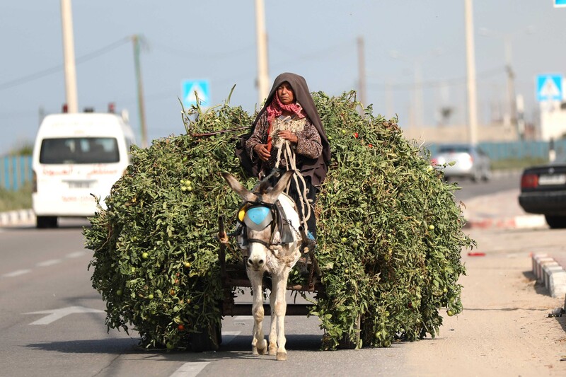A Palestinian woman drives her donkey-drawn cart along the coastal road in Gaza City on 30 November.