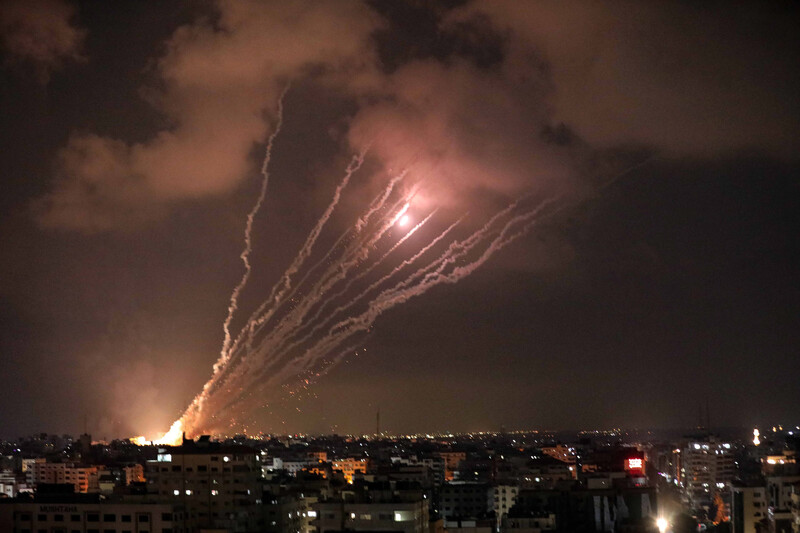 A salvo of rockets is fired from Gaza City toward Israel on 6 August.