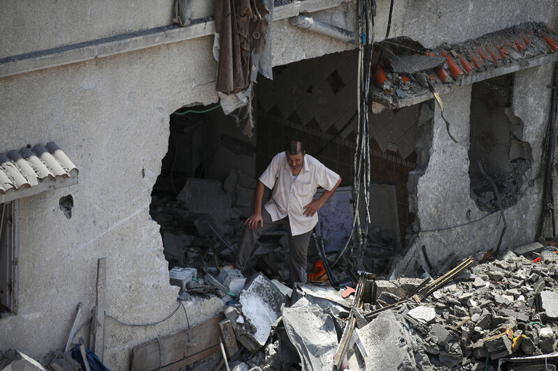 A Palestinian man observes the damage in the Sheikh Ijlin neigborhood of Gaza City after an Israeli air raid, 6 August.