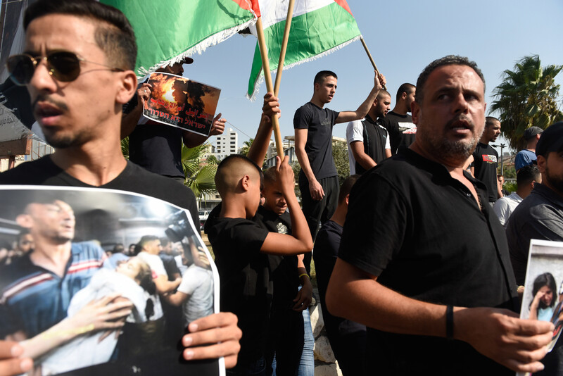 Palestinians in Um al-Fahm, a Palestinian city in Israel, protest against the Israeli military offensive in Gaza on 6 August.