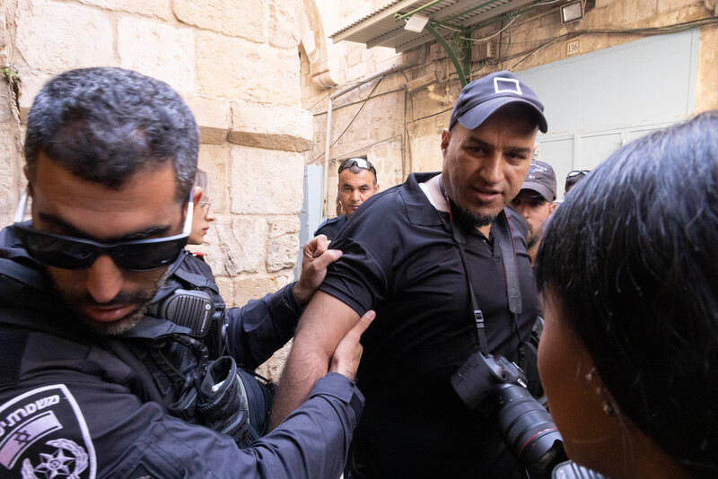Israeli police arrest AFP photojournalist Ahmad Gharabli in Jerusalem’s Old City on 7 August. Gharabli was detained as he covered Itamar Ben Gvi’r’s provocative visit to the al-Aqsa mosque compound during the annual Tisha B’Av day of mourning.