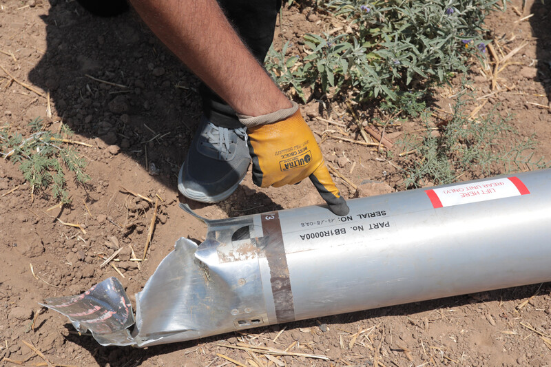 Palestinian bomb disposal experts remove unexploded missiles fired by Israel that fell on agricultural land in Gaza days earlier, 11 August.