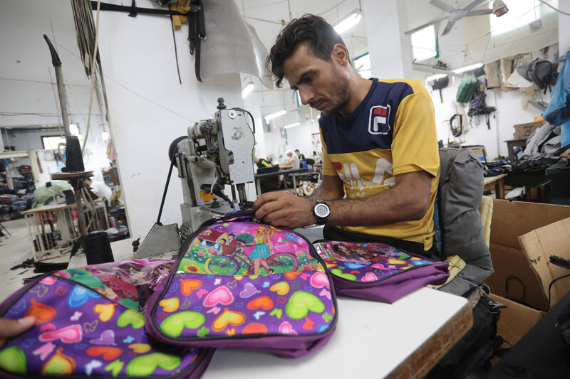 A Palestinian worker sews backpacks before the start of the new school year at a factory in Deir al-Balah, central Gaza Strip, on 15 August.