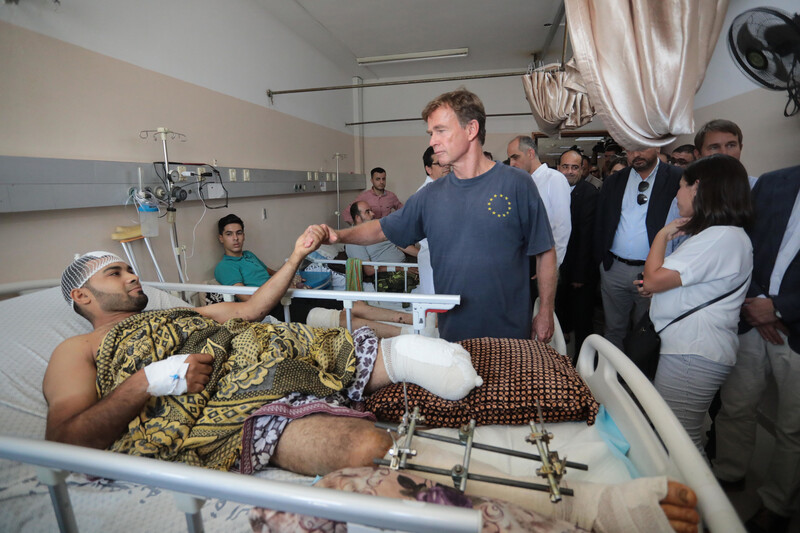 Sven Kühn von Burgsdorff, the European Union’s representative to the Palestinian Authority, visits Palestinians injured during Israel’s latest bombing campaign in Gaza at al-Shifa hospital in Gaza City, 16 August.