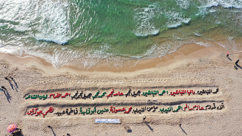 An aerial view of the names of children killed during Israel’s latest bombing campaign in Gaza carved in sand in Gaza Cty on 17 August.