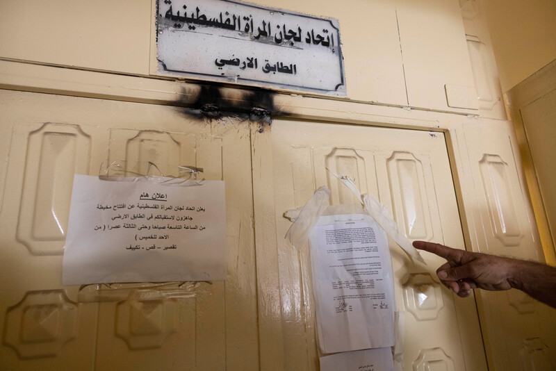 Israeli military closure notices are posted on the entry to the office of the Union of Palestinian Women’s Committees in the West Bank city of Ramallah after the feminist organization, along with six other prominent groups, were raided and sealed shut in the early hours of 18 August. The groups were previously declared as terrorist organizations by Israeli defense minister Benny Gantz late last year.