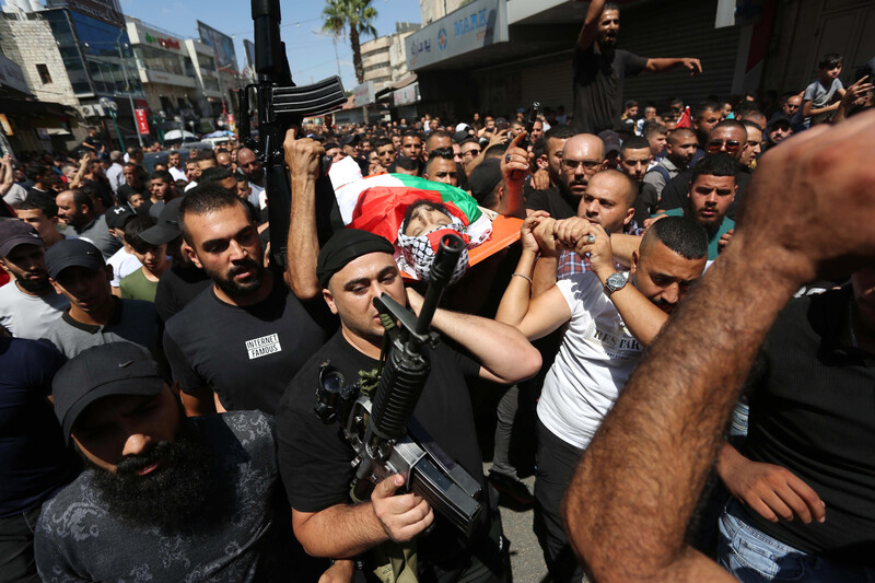 Palestinians carry the body of Muhammad Arayshi, who died from wounds inflicted during an Israeli raid two weeks earlier, during his funeral in the West Bank city of Nablus on 23 August. Two other fighters were killed during a 9 August raid in which Arayshi, 25, was injured.