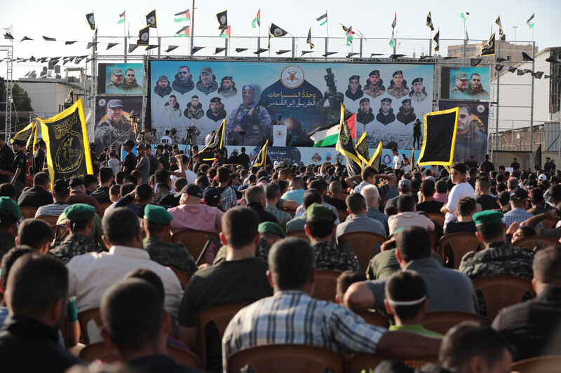 Supporters of the Islamic Jihad armed resistance movement take part in memorial service for Palestinians who were killed by Israeli forces in the West Bank and during Israeli strikes on Gaza earlier in the month, Rafah, southern Gaza Strip, 25 August.