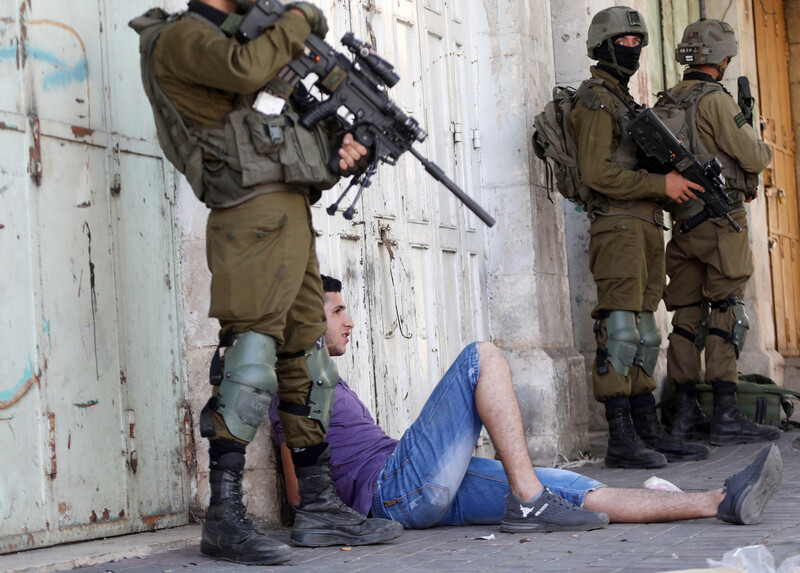 Israeli forces detain a Palestinian youth during confrontations following a demonstration against settlements in the West Bank city of Hebron on 26 August.
