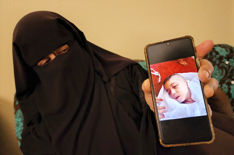 A family member displays a photo of Farouq Muhammad Abu Naja, 6, who died after Israel delayed granting him a permit for medical treatment in Jerusalem, at their home in Khan Younis, southern Gaza Strip, on 28 August.
