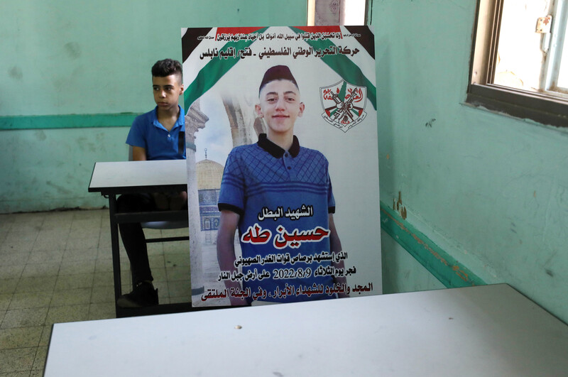 A poster of Hussein Taha, a 16-year-old killed by Israeli forces on 9 August, is displayed at an empty desk on the first day of school in the West Bank city of Nablus on 29 August.