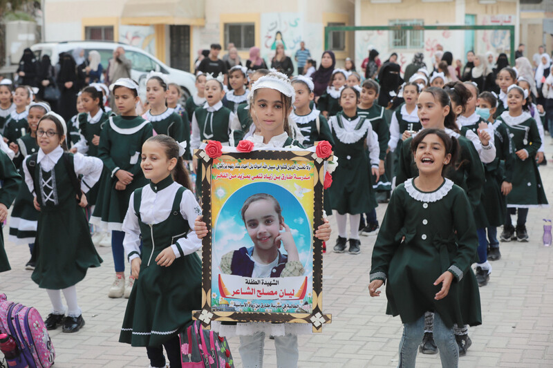 A Palestinian girl holds a poster commemorating Layan al-Shaer, who died of injuries sustained during an Israeli airstrike earlier in the month, on the first day of the new school year in Khan Younis, southern Gaza Strip, 29 August.
