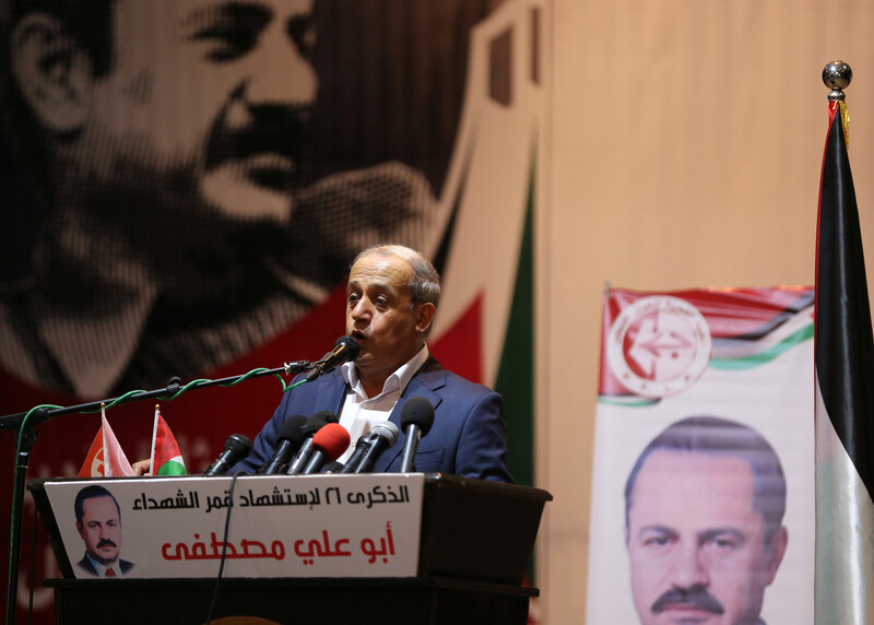 Jamil Mezher, deputy secretary-general of the Popular Front for the Liberation of Palestine, a leftist faction, speaks during an event in Gaza City marking the 21st anniversary of the assassination of PFLP leader Abu Ali Mustafa on 30 August. Mustafa was killed in an Israeli missile attack in the West Bank city of Ramallah in 2001.