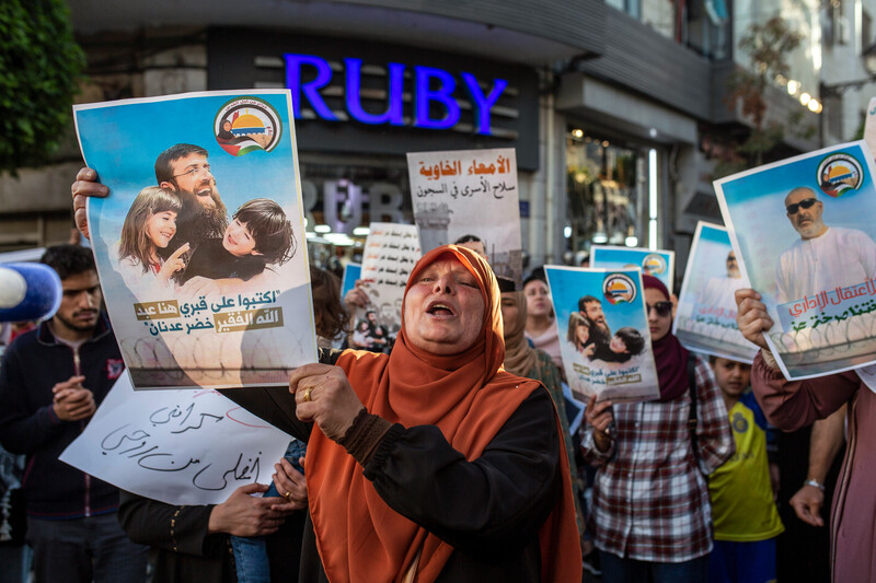 Palestinians demonstrate in Ramallah following the death of Khader Adnan after three months of hunger strike in Israeli detention, 3 May. Adnan was arrested a total of 12 times, sometimes held without charge and trial under administrative detention orders, and had undertaken five hunger strikes.