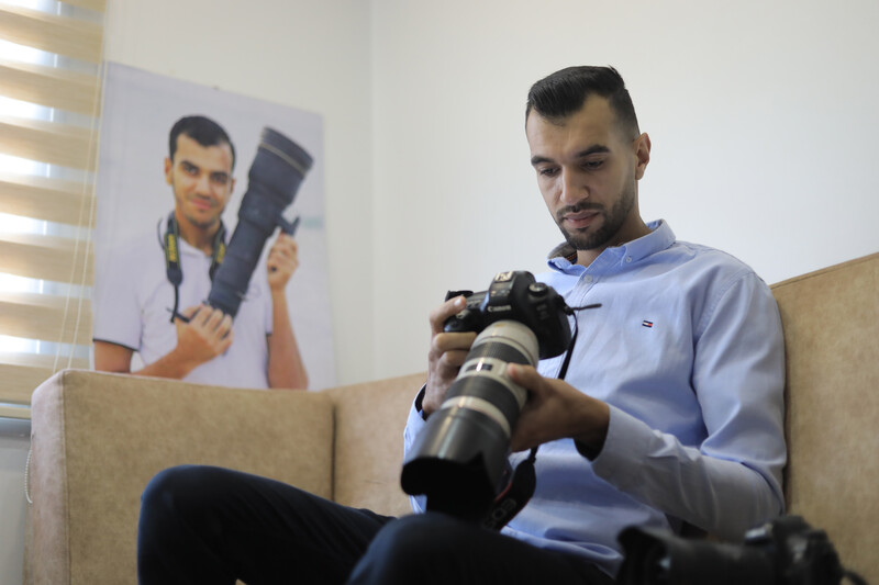 A Palestinian photojournalist Mutasim Murtaja, the brother of Yaser Murtaja, who was killed by an Israeli military sniper while documenting Great March of Return protests in 2018, at his Gaza City office on 3 May, World Press Freedom Day. Israeli occupation authorities continue to detain 16 Palestinian journalists, four of whom are held without charge or trial under administrative detention orders, according to Palestinian sources.