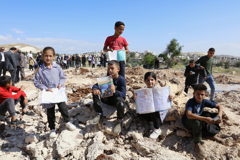 Children gather near the rubble of Jibb al-Deeb School, demolished by Israeli troops in the Palestinian hamlet of Beit Tamar, east of the West Bank city of Bethlehem, 7 May. Israel razed the European Union-funded school that was rebuilt after being demolished by the Israeli authorities in 2017.