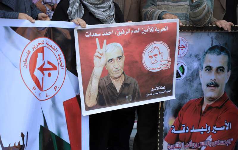 Supporters of the Popular Front for the Liberation of Palestine protest in Gaza City in solidarity with Palestinian political prisoners held by Israel, 8 May. Earlier that day, Israeli forces stormed Ramon Prison and transferred PFLP secretary-general Ahmad Saadat and party leaders Ahed Abu Gholami and Walid Hanatsheh from the prison to solitary confinement.