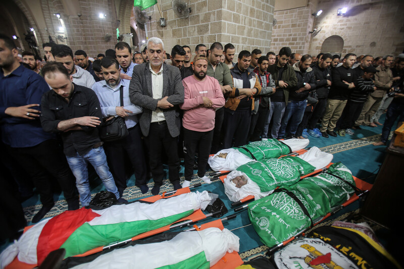 Mourners attend the Gaza City funeral for several Palestinians killed in surprise Israeli airstrikes, 9 May.