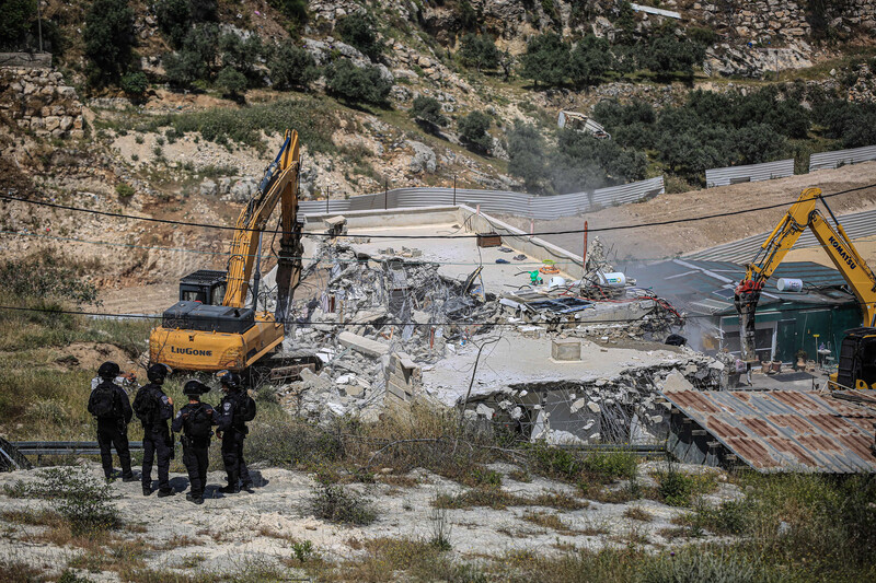 Israeli bulldozers demolish Palestinian homes in the East Jerusalem neighborhood of Jabal al-Mukabbir on 10 May. The two homes, owned by brothers Firas and Ali Shuqairat, were destroyed under the pretext that they lacked a building permit, which are granted only rarely to Palestinians in East Jerusalem.
