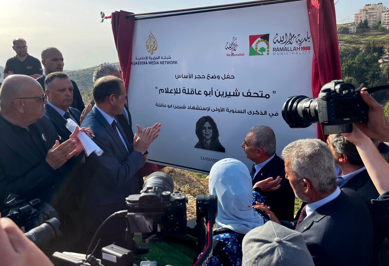 Palestinian officials and members of Shireen Abu Akleh’s family lay the foundation stone for a museum honoring the Al Jazeera reporter in the West Bank city of Ramallah on 11 May, the first anniversary of her killing by an Israeli army sniper while covering a raid in the West Bank city of Jenin.