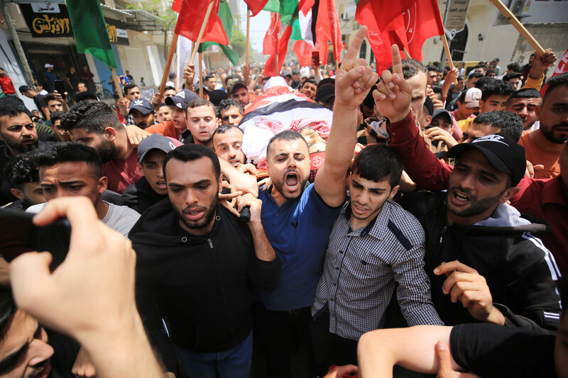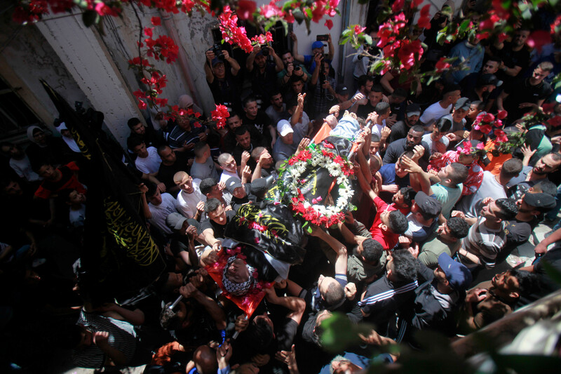 Mourners carry the body of Saleh Muhammad Saleh Sabri, 22, during his funeral in Askar refugee camp, east of the West Bank city of Nablus, 15 May. Sabri was shot in the chest and killed during an Israeli raid.