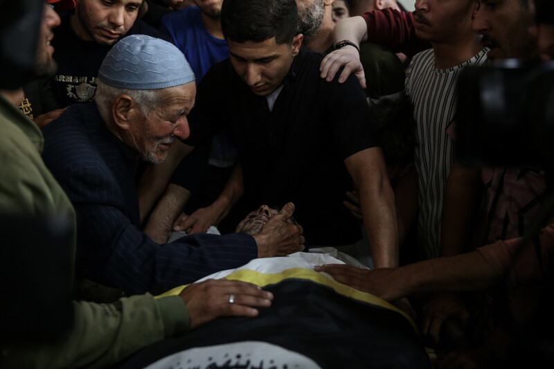 Mourners attend the funeral of Udai al-Louh, 25, a Palestinian resistance fighter killed in an Israeli strike, Nuseirat refugee camp, central Gaza Strip, 12 May.