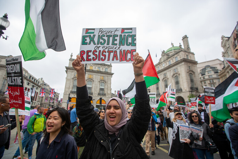 Protesters in London march from the BBC to Downing Street in commemoration of the 75th anniversary of the Nakba, 13 May.