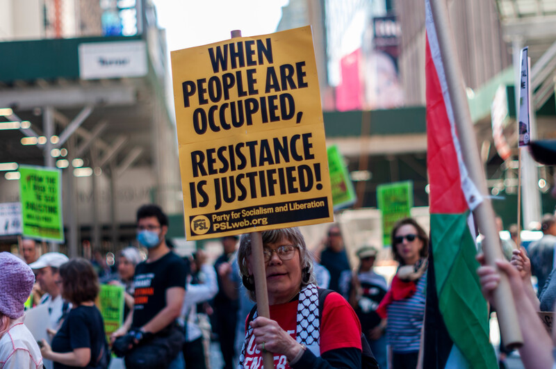 Palestinians and their supporters commemorate Nakba Day in New York City’s Times Square on 14 May.