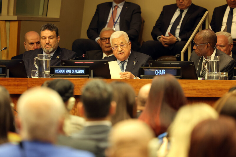 Palestinian Authority leader Mahmoud Abbas speaks during a high-level event commemorating the 75th anniversary of the Nakba at the United Nations headquarters in New York on 15 May.