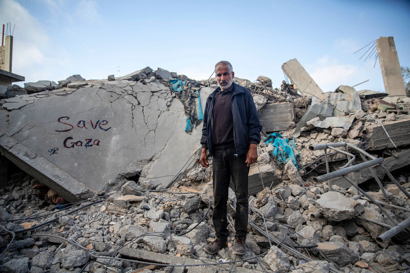 Yahia Kamel Salem Abu Obaid, 55, stands in front of his destroyed home in Deir al-Balah, central Gaza Strip, 15 May. Ten members from three generations of the family were displaced after the home was bombed by Israel on 13 May, damaging surrounding dwellings and displacing dozens of neighbors.