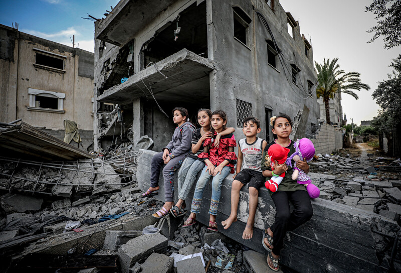 Palestinian children sit on the rubble of their house in Deir al-Balah, central Gaza Strip, after it was destroyed in an Israeli airstrike on 13 May.
