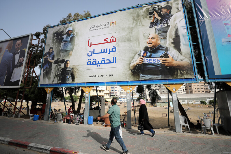 A billboard in Gaza City thanks Palestinian journalists following Israel’s latest major offensive in the territory, during which foreign press crews were prevented from entering Gaza, 17 May.