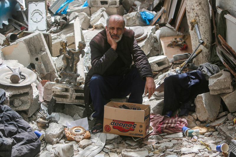 Hazem Muhanna, 62, sits on the rubble of his Gaza City home that was destroyed in an Israeli airstrike, 17 May. His home held a private collection of archaeological artifacts and items of Palestinian cultural significance, such as identity papers, embroidered dresses and copper artifacts.
