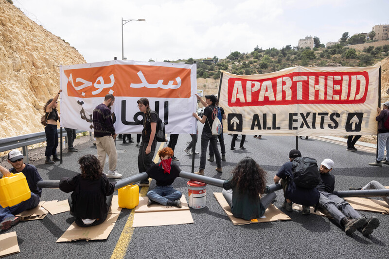 Israeli and international activists block a road near Gilo settlement in the West Bank to stop extremist settlers from attending the annual ultra-nationalist flag march in Jerusalem, 18 May.