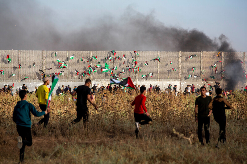 Hundreds of Palestinians gather at the Israeli barrier surrounding Gaza, east of Gaza City, in protest against the ultra-nationalist flag march in the Old City of Jerusalem, 18 May.
