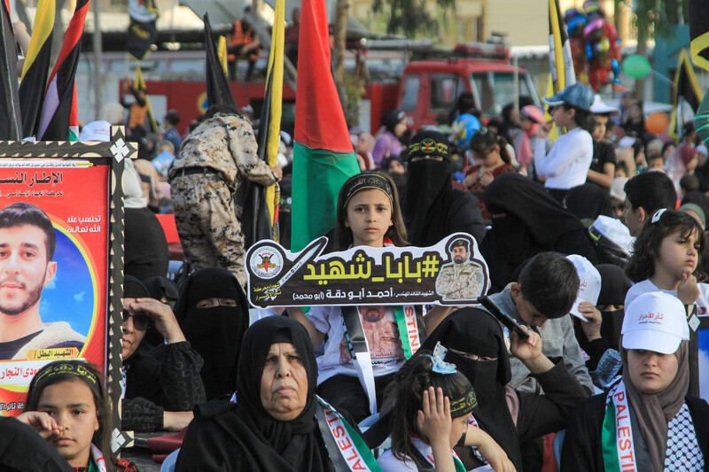 Supporters of the Islamic Jihad resistance faction rally in Gaza City to commemorate the group’s commanders and operatives killed by Israel, 19 May.